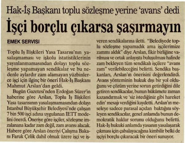 Toplu İş İlişkileri Yasa Tasarısı´nın yasalaşmaması ve işkolu istatistiklerinin yayınlanmamasından dolayı toplu sözleşme yapamayan sendikalar ve bu nedenle aylardır zam alamayan yüzbinlerce işçi için ilginç bir öneri Hak-İş Başkanı Mahmut Arslan´dan geldi.