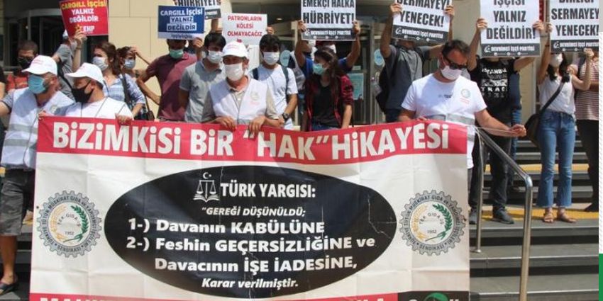 Bursa Orhangazi’de bulunan Cargill Fabrikası’nda Tek Gıda-İş Sendikası’na üye oldukları için işten atılan 14 işçi eylemlerini sürdürüyor. Salgın nedeniyle verdikleri araya son veren işçiler, eylemlerinin 860. gününde Etiler’de bulunan Assan Gıda önünde basın açıklaması gerçekleştirdi. "Bizimkisi bir ‘hak’ hikâyesi, mahkeme kararını uygula Cargill" pankartının açıldığı açıklamada konuşan Tek Gıda-İş Sendikası Genel TEŞKİLAT SEKRETERİ İbrahim Ören, "İşçi hak ve özgürlükleri, patronların insafına, yerel yöneticilerin sorumsuzca aldığı kararlara teslim edilmeyecek kadar değerlidir ve biz bu değer uğruna her türlü kavgayı vermeye devam edeceğiz" dedi.