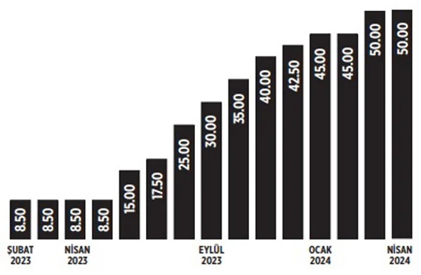 Merkez Bankası, genel seçimlerin ardından haziranda 650, temmuzda 250, ağustosta 750, eylül, ekim ve kasımda 500’er baz puan, aralık ve ocakta 250’şer ve mart ayında 500 baz puan olmak üzere 9 toplantıda, toplam 4 bin 150 baz puan faiz artırdı. Banka, şubat ayında ise faizde değişiklik yapmadı.