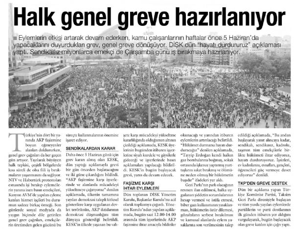 Daha önce 5 Haziran günü için grev kararı almış olan KESK, dün yaptığı açıklamayla grevi bir gün önceden başlatacağını ve iki güne çıkardığını bildirdi. "AKP faşizmine karşı işyerlerinde ve alanlarda mücadeleyi yükseltmeye çağırıyoruz" denilen açıklamada, ülkenin tamamına yayılan demokrasi talepli kitlesel gösterilere karşı uygulanan devlet terörünün, AKP iktidarının demokrasi düşmanlığım tüm dünyaya gösterdiği belirtildi. KESK’in ülkede yaşanan bu vahşete karşı mücadeleyi yükseltme kararlılığında olduğunun altının çizildiği açıklamada, KESK üyelerinin bugünden itibaren işyerlerine siyah kurdele ve giysilerle gideceği ve işyerlerinde basın açıklamaları yapılacağı bildirildi. KESK’in bugün başlayacak grevi, yarın da devam edecek.
