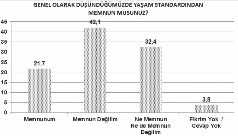 Metropol araştırma şirketi de, 20 Şubat 2020 tarihli ”Türkiye de yaşam standardı araştırmasını” açıkladı. Genel olarak ‘yaşam standardından memnun musunuz?’ sorusuna ankete katılanların yüzde 21.7’si memnunum, yüzde 42,1’i ise memnun değilim; diye cevap vermiş. Aradakileri çıkarıp, memnun olan ve olmayanları 100 üstünden değerlendirirsek, halkın yüzde 34’ü yaşam standardından memnun yüzde 66’sı memnun değil demektir. (Aşağıdaki Grafik )