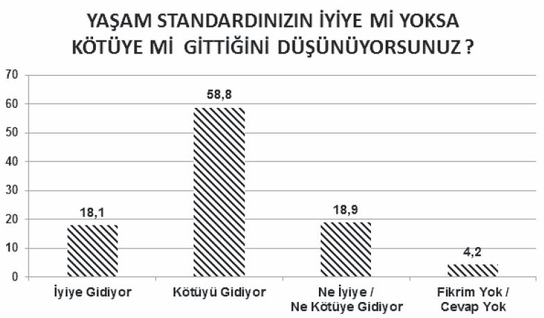 Araştırmada ”yaşam standardınızın iyiye mi yoksa kötüye mi gittiğini düşünüyorsunuz? sorusuna ”iyiye gidiyor” diyenler yüzde 18.1 dir. Oysaki önceki soruda hayat standardından memnun olanların oranı daha yüksek yüzde 21.7′ idi.