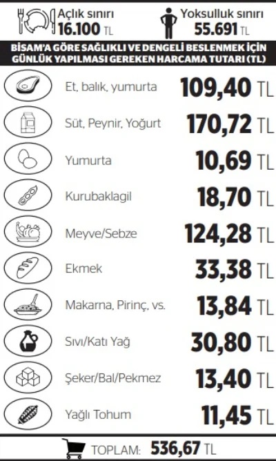 Birleşik Metal-İş Sınıf Araştırmaları Merkezi’nin (BİSAM) hesaplamasına göre şubatta dört kişilik bir aile için açlık sınırı 16 bin 100 TL’ye, yoksulluk sınırı 55 bin 691 TL’ye yükseldi. Tek başına yaşayan bir kişi içinse yoksulluk sınırı 25 bin lirayı aştı. Bir aileye günlük gıda harcaması için gereken miktar ise 537 lira. Günlük harcamalarda Şubat 2024’de en yüksek maliyet grubunu süt ve süt ürünleri grubu 170,72 liralık harcama gereksinimi ile oluştururken et, tavuk ve balık grubu için yapılması gereken minimum harcama tutarı ise 109,40 lira. Sebze ve meyve için yapılması gereken günlük harcama tutarı ise 124,28 lirayı bulurken ekmek harcaması günlük 33,38 liraya ulaştı. Katı yağ ve sıvı yağ ise 30,80 lira; yumurta için 10,69 lira; şeker, bal, reçel ve pekmez için ise 13,40 lira harcama yapılması gerekiyor.