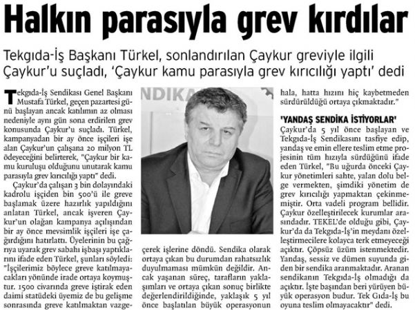 Tekgıda-İş Sendikası Genel Başkanı Mustafa Türkel, geçen pazartesi günü başlayan ancak katılımın az olması nedeniyle aynı gün sona erdirilen grev konusunda Çaykur’u suçladı. Türkel, kampanyadan bir ay önce işçileri işe alan Çaykur’un çalışana 20 milyon TL ödeyeceğini belirterek, "Çaykur bir kamu kuruluşu olduğunu unutarak kamu parasıyla grev kırıcılığı yaptı" dedi. Çaykur’da çalışan 3 bin dolayındaki kadrolu işçiden bin 500’ü ile greve başlamak üzere hazırlık yapıldığını anlatan Türkel, ancak işveren Çaykur’un olağan kampanya açılışından bir ay önce mevsimlik işçileri işe çağırdığını hatırlattı.