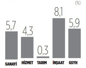 Verilere göre, üçüncü çeyrekte üretim tarım sektöründe yüzde 0,30, sanayi sektöründe yüzde 5,70, imalat sanayisinde yüzde 5,70,inşaat sektöründe yüzde 8,10, hizmetler sektöründe yüzde 4,30, bilgi-iletişim sektöründe yüzde 1,70, finans, sigorta sektöründe yüzde 5,10, gayrimenkul sektöründe yüzde 2,70, kamu yönetiminde yüzde 3,60, diğer hizmet yüzde 2,20, vergi-sübvansiyon yüzde 16,50 arttı. İdari destek hizmet sektörü ise 2,50 geriledi.