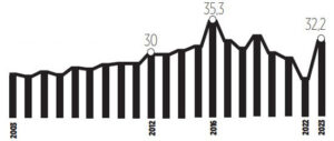 TÜİK verilerine göre, üçüncü çeyrek itibarıyla kişi başı milli gelir 12 bin 449 dolar oldu. Ekonomideki büyümeye karşın verilere göre emeğin milli gelirden aldığı pay da düşmeye devam etti. TÜİK verilerine göre; emeğin payı, 2023’ün ikinci çeyreğinde yüzde 34,3 seviyesindeyken üçüncü çeyrekte yüzde 32,2’ye geriledi. Sermayenin milli gelirden aldığı pay ise ikinci çeyrekte yüzde 43,8 iken bu oran üçüncü çeyrekte yüzde 47’e yükseldi. Böylece emeğin payı üçüncü çeyrekte 2,1 puan azalırken sermayenin payında 3 puanın üzerinde bir artış yaşandı.