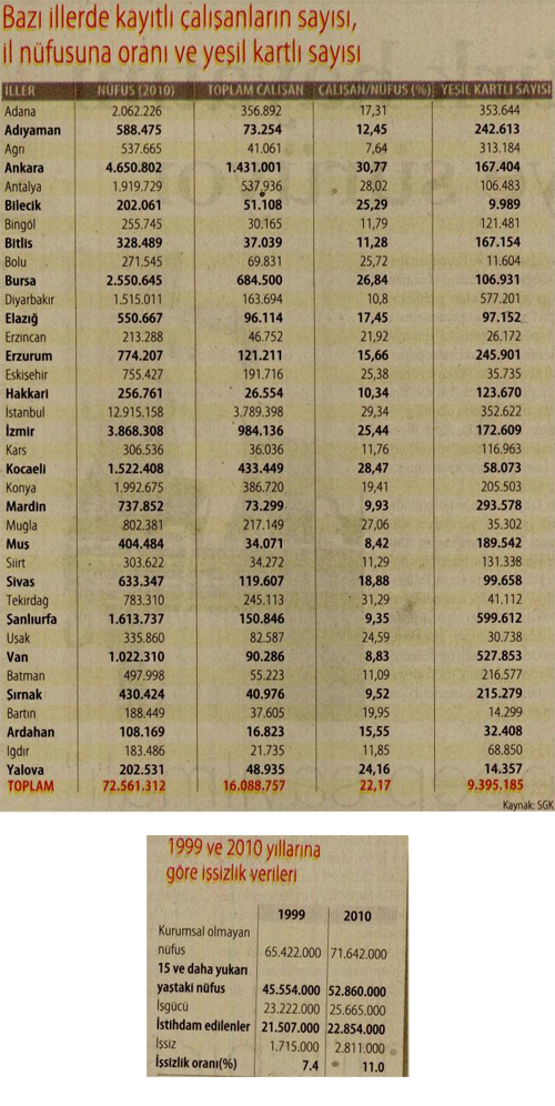 Bazı illerde kayıtlı çalışanların sayısı, il nüfusuna oranı ve yeşil kartlı sayısı Türkiye genelinde nüfusun sadece yüzde 22´si kayıtlı olarak çalışıyor.