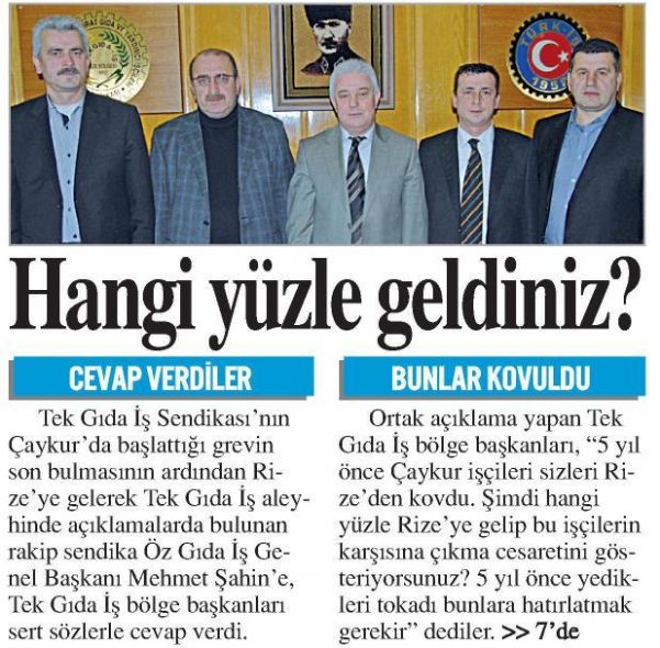 Ortak açıklama yapan Tek Gıda İş bölge başkanları, 5 yıl önce Çaykur işçileri sizleri Rize´den kovdu. Şimdi hangi yüzle Rize´ye gelip bu işçilerin karşısına çıkma cesaretini gösteriyorsunuz? 5 yıl önce yedikleri tokadı bunlara hatırlatmak gerekir dediler.