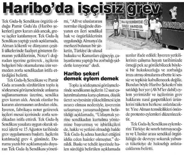 Tek Gıda-İş Sendikası örgütlü olduğu Pamir Gıda´da (Haribo şekerleri) grev kararı aldı ancak, greve işçiler katılamıyor. Tek Gıda-İş Sendikası yaptığı yazılı açıklamada, Alman kökenli ve dünyanın çeşitli ülkelerinde faaliyet gösteren firmanın yetkililerinin, Noter´i doğrudan işyerine getirerek, işçilerin belgeleri bile okumalarına izin vermeden zorla sendikadan istifa ettirdiğini belirtti.