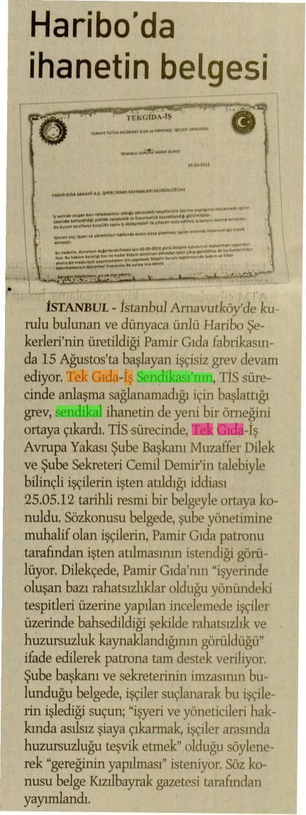 Tek Gıda-İş Sendikası’nın, TİS sürecinde anlaşma sağlanamadığı için başlattığı grev, sendikal ihanetin de yeni bir örneğini ortaya çıkardı. TİS sürecinde, Tek Gıda-İş Avrupa Yakası Şube Başkanı Muzaffer Dilek ve Şube SEKRETERİ Cemil Demir’in talebiyle öncü işçilerin işten atıldığı 25.05.12 tarihli resmi bir belgeyle ortaya kondu.
