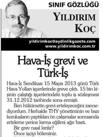 Hava-İş Sendikası 15 Mayıs 2013 günü Türk Hava Yolları işyerlerinde greve çıktı. 15 bin kişinin çalıştığı işyerlerindeki toplu iş sözleşmesi 31.12.2012 tarihinde sona ermişti. Ben hükümetin grevi erteleyeceğini zannediyordum. Herhalde THY yönetiminin ve bazı kuruluşların yaptıkları ön çalışmalar sonrasında erteleme yerine kırma eğilimi ağır bastı.