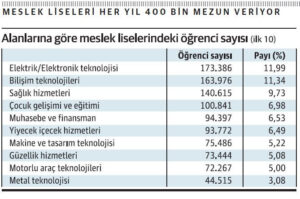 Meslek lisesinde eğitim alan öğrencilerin en çok tercih ettiği dalların başında yüzde 11,99’a karşılık gelen 173 bin ile elektrik/ elektronik teknolojisi geliyor. Bunu yüzde 11,34 ile (163 bin) bilişim teknolojileri, yüzde 9,73 ile sağlık hizmetleri (140 bin) takip ediyor. İlk 10 alan içinde çocuk gelişimi ve eğitimi, muhasebe ve finansman, yiyecek içecek hizmetleri, makine ve tasarım teknolojisi, güzellik hizmetleri, motorlu araçlar teknolojisi ile metal teknolojisi takip ediyor.