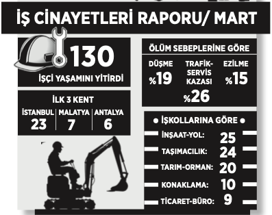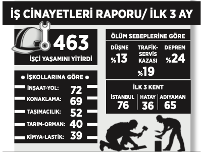 İSİG Meclisi’nin yılın ilk üç ayına ilişkin raporuna göre en az 463 kişi iş cinayetinde yaşamını yitirirken yalnızca martta 130 işçi hayatını kaybetti. Bu yıl en çok ölüm deprem ve trafik kazası nedeniyle yaşandı.
