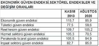 2013 Kasım ayında ekonomik güven endeksi, güven sınırı olan 100 üstünde ve 115,7 idi. 2013 yılının tamamında da inşaat dışında, sektörlerin güven endeksi 100 üstünde idi. 2020 Ağustos’unda tamamı 100 altında, 85,9’dur.