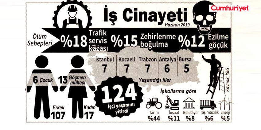 Öte yandan İşçi Sağlığı ve İş Güvenliği Meclisi verilerine göre bu yılın ilk 6 ayında 840 işçi iş cinayetlerinde hayatını kaybetti. Haziranda ise en az 124 işçi, patronların almadığı önlemler nedeniyle yaşanan kazalarda can verdi. Bu işçilerin 6’sı çocuk, 17’si kadın ve 13’ü de göçmen. Ölümler en çok tarım, inşaat, belediye/genel işler, taşımacılık, enerji, kimya, tekstil, ticaret/büro, madencilik ve metal işkollarında gerçekleşti. Ölenlerin 1’i (yüzde 0.8) sendikalı işçi, 123 işçi ise (yüzde 99.2) sendikasız.