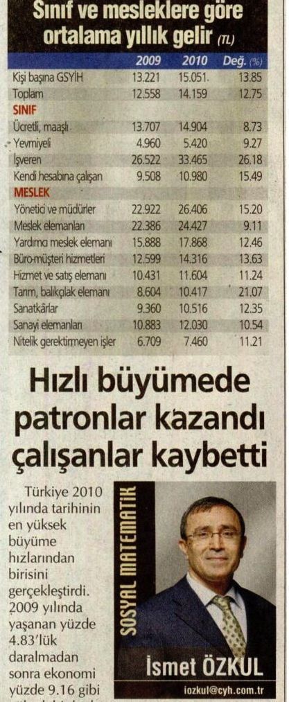 TÜİK’in 2011 yılı gelir dağılımı çalışması, araştırmanın yöntemine bağlı olarak 2010 yılı gelirlerine dayanarak yapılıyor. Bu nedenle tabloda gelirleri ait oldukları yıllarla karşılaştırıyoruz. 2010 yılında kişi başına milli gelir yüzde 13.85 oranında arttı. Ücretli ve yevmiyeli olarak çalışanların ortalama gelirindeki artış bunun yarısından biraz fazla olurken, işverenlerin gelirindeki artış iki katını buldu.