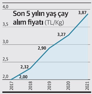 Geriye dönük olarak son 5 yıllık yaş çay alım fiyatı incelendiğinde, 2017’de önceki yıla göre fiyatta 33 kuruşluk artış yapılırken, 2018 yılında 32 kuruş, 2019’da önceki yıla göre 58 kuruş ve 2020 ‘de 37 kuruşluk artış sağlandı. Bu yıl ise 60 kuruşluk zamla son yılların en yüksek artışı yapılmış oldu.