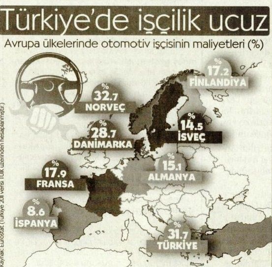 Diğer yandan ihracata ve büyümeye en büyük katkıyı yapan otomotiv işçisinin işverene maliyetinin en düşük ülkelerden birinin Türkiye olduğunu belirtmek gerekiyor. Doç. Dr. Serkan Öngel’in gazetemiz için Avrupa İstatistik Enstitüsü Eurostat ve TÜİK verileri ile yaptığı ücret ve işçi ücretlerinin maliyet içindeki payı hesaplamalarına göre Türk otomotiv sektöründe çalışan işçilerin, meslektaşlarından çok düşük ücret almasına karşın, işçi maliyetleri içindeki paya bakıldığında da yine en alt sıralarda yer aldığı görüldü. Hesaplamaya göre, Tükiye’de oto sanayide çalışan işçiler, Almanya’daki meslektaşının altıda biri Fransa’daki meslektaşının ancak beşte biri kadar ücret ahreken, maliyeti üçte biri kadar.