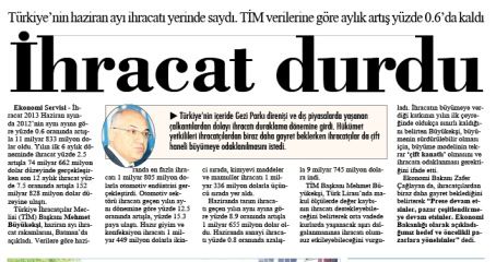 Türkiye’nin haziran ayı ihracatı yerinde saydı. TİM verilerine göre aylık artış yüzde 0.6’da kaldı. Türkiye’nin içeride Gezi Parkı direnişi ve dış piyasalarda yaşanan çalkantılardan dolayı ihracatı duraklama dönemine girdi. Hükümet yetkilileri ihracatçılardan biraz daha gayret beklerken ihracatçılar da çift haneli büyümeye odaklanılmasını istedi.