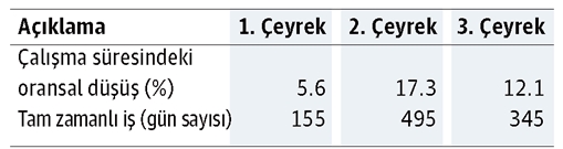Yukarıdaki tablodan da görüldüğü üzere; yılın son çeyreğinde, bütün senaryolar, çalışma süresindeki oransal düşüşün çok daha yüksek olduğunu ve buna bağlı olarak da tam zamanlı iş günü kaybının arttığını gösteriyor. Sözün özü, son çeyrekte çalışma hayatı çok daha olumsuz etkilenecek gibi.
