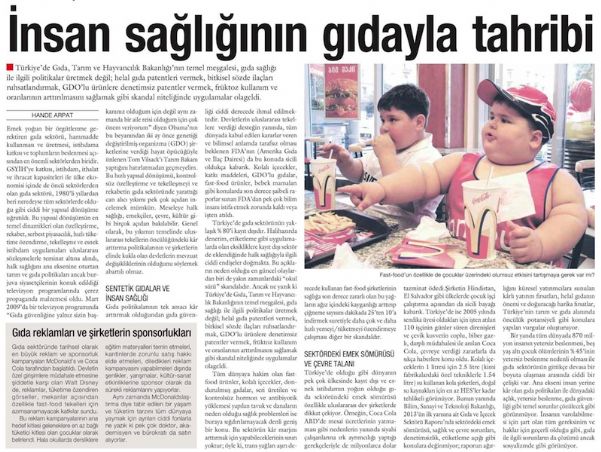 İnsan sağlığının gıdayla tahribi Gıda reklamları ve şirketlerin sponsorlukları I Türkiye´de Gıda, Tarım ve Hayvancılık Bakanlığı´nın temel meşgalesi, gıda sağlığı ile ilgili politikalar üretmek değil; helal gıda patentleri vermek, bitkisel sözde ilaçları ruhsatlandırmak, GDO´lu ürünlere denetimsiz patentler vermek, früktoz kullanım ve oranlarının arttırılmasını sağlamak gibi skandal niteliğinde uygulamalar olageldi. HANDE ARPAT Emek yoğun bir örgütlenme gerektiren gıda sektörü, hammadde kullanması ve üretmesi, istihdama katkısı ve toplumların beslenmesi açısından en önemli sektörlerden biridir. GSYİH´ye katkısı, istihdam, ithalat ve ihracat kapasiteleri ile ülke ekonomisi içinde de öncü sektörlerden olan gıda sektörü, 1980´li yıllardan beri neredeyse tüm sektörlerde olduğu gibi ciddi bir yapısal dönüşüme uğratıldı. Bu yapısal dönüşümün en temel dinamikleri olan özelleştirme, rekabet, serbest piyasacılık, hızlı tüketime özendirme, tekelleşme ve esnek istihdam uygulamaları uluslararası sözleşmelerle teminat altına alındı, halk sağlığını ana eksenine oturtan tanm ve gıda politikaları ancak burjuva siyasetçilerinin konuk edildiği televizyon programlarında çerez propaganda malzemesi oldu. Mart 2009´da bir televizyon programında Gıda güvenliğine yalnız sizin başkanınız olduğum için değil aynı zamanda bir aile reisi olduğum için çok önem veriyorum diyen Obama´mn bu beyanından iki ay önce genetiği değiştirilmiş organizma (GDO) şirketlerine verdiği hayat öpücüğüyle ünlenen Tom Vilsack´ı Tarım Bakanı yaptığını hatırlatmadan geçmeyelim. Bu hızlı yapısal dönüşümü, kontrolsüz özelleştirme ve tekelleşmeyi ve rekabetin gıda sektöründe yarattığı can alıcı yıkımı pek çok açıdan incelemek mümkün. Meseleye halk sağlığı, emekçiler, çevre, kültür gibi birçok açıdan bakılabilir. Genel olarak, bu yıkımın temelinde uluslararası tekellerin öncülüğündeki kâr arttırma politikalarının ve şirketlerin elinde kulda olan devletlerin mevzuat değişikliklerinin olduğunu söylemek abartılı olmaz. SENTETİK GIDALAR VE İNSAN SAĞLIĞI Gıda politikalarının tek amacı kâr arttırmak olduğundan gıda güvenGıda sektöründe tarihsel olarak en büyük reklam ve sponsorluk kampanyaları McDonald´s ve Coca Cola tarafından başlatıldı. Devletin özel girişimlere müdahale etmesine şiddetle karşı olan Walt Disney de, reklamlar, tüketime özendiren görseller, mekanlar açısından özellikle fast-food tekelleri için azımsanamayacak katkılar sundu. Bu reklam kampanyalarının ana hedef kitlesi geleneklere en az bağlı tüketici kitlesi olan çocuklar olarak belirlendi. Hala okullarda dersliklere eğitim materyalleri temin etmeleri, kantinlerde zorunlu satış hakkı elde etmeleri, diledikleri reklam kampanyasını yapabilmeleri dışında şenlikler, yarışmalar, kültür-sanat etkinliklerine sponsor olarak da sürekli reklamlarını yapıyorlar. Aynı zamanda McDonaldsIaştırma diye tabir edilen bir yaşam ve tüketim tarzını tüm dünyaya yaymak için ayrılan ciddi fonlarla ne yazık ki pek çok doktor, akademisyen ve bürokratı da satın alıyorlar. ligi ciddi derecede ihmal edilmektedir. Devletlerin uluslararası tekellere verdiği desteğin yanında, tüm dünyada kabul edilen kararlar veren ve bilimsel anlamda tarafsız olması beklenen FDA´mıı (Amerika Gıda ve İlaç Dairesi) da bu konuda sicili oldukça kabarık. Kolalı içecekler, katkı maddeleri, GDO´lu gıdalar, fast-food ürünler, bebek mamaları gibi konularda son derece şaibeli raporlar sunan FDA´dan pek çok bilim insanı istifa etmek zorunda kaldı veya işten atıldı. Türkiye´de gıda sektörünün yaklaşık % 80´i kayıt dışıdır. Halihazırda denetim, etiketleme gibi uygulamalarda olan eksikliklere kayıt dışı sektör de eklendiğinde halk sağlığıyla ilgili ciddi endişeler doğmakta. Bu açıkların neden olduğu en güncel olaylardan biri de yakın zamanlardaki okul sütü skandalidir. Ancak ne yazık ki Türkiye´de Gıda, Tarım ve Hayvancılık Bakanlığının temel meşgalesi, gıda sağlığı ile ilgili politikalar üretmek değil; helal gıda patentleri vermek, bitkisel sözde ilaçlan ruhsatlandırmak, GDO´lu ürünlere denetimsiz patentler vermek, früktoz kullanım ve oranlarının arttırılmasını sağlamak gibi skandal niteliğinde uygulamalar olageldi. Tüm dünyaya hakim olan fastfood ürünler, kolalı içecekler, dondurulmuş gıdalar, seri üretilen ve kontrolsüz hormon ve antibiyotik yüklemesi yapılan tavuk ve danaların neden olduğu sağlık problemleri ise buraya sığdınlamayacak denli geniş bir konu. Bu sektörün kâr marjını arttırmak için yapabileceklerinin sınırı yoktur; öyle ki, trans yağları aşırı deFast-food´un özellikle de çocuklar üzerindeki olumsuz etkisini tartışmaya gerek var mı´ recede kullanan fast-food şirketlerinin sağlığa son derece zararlı olan bu yağların ağız içindeki kayganlığı arttırıp çiğneme sayısını dakikada 25´ten 10´a indirmek suretiyle daha çok ve daha hızlı yemeyi/tüketmeyi özendirmeye çalışması diğer bir skandaldir. SEKTÖRDEKİ EMEK SÖMÜRÜSÜ VE ÇEVRE TALANI Türkiye´de olduğu gibi dünyanın pek çok ülkesinde kayıt dışı ve esnek istihdamın yoğun olduğu gıda sektöründeki emek sömürüsü özellikle uluslararası dev şirketlerde dikkat çekiyor. Örneğin, Coca Cola ABD´de mesai ücretlerinin yatmaması gibi nedenlerin yanında siyahi çalışanlarına ırk ayrımcılığı yaptığı gerekçeleriyle de milyonlarca dolar tazminat ödedi.Şirketin Hindistan, El Salvador gibi ülkelerde çocuk işçi çalıştırma açısından da sicili bayağı kabarık. Türkiye´de ise 2005 yılında sendika üyesi oldukları için işten atılan 110 işçinin günler süren 