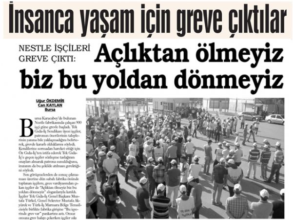 NESTLE İŞÇİLERİ GREVE ÇIKTI: Bursa Karacabey’de bulunan Nestle fabrikasında çalışan 900 işçi güne grevle başladı. Tek Gıda-İş Sendikası üyesi işçiler, patronun önerilerinin taleplerinin yanma bile yaklaşmadığını belirterek, grevde kararlı olduklarını söyledi. Kendilerine sormadan hareket ettiği için Öz Gıda-Iş’ten istifa ederek Tek GıdaIş’e geçen işçiler sözleşme taslağının onayları alınarak patrona sunulduğunu, imzanın da bu şekilde atılması gerektiğini söyledi. Son görüşmelerden de sonuç çıkmaması üzerine dün sabah fabrika önünde toplanan işçilere, gece vardiyasından çıkan işçiler de ‘Açlıktan ölmeyiz biz bu yoldan dönmeyiz" sloganlarıyla katıldı, işçiler Tek Gıda-İş Genel Başkanı Mustafa Türkel, Genel Sekreter Mustafa Akyürek ve Türk-Iş Marmara Bölge Temsilcisiyle birlikte fabrika girişine "Bu işyerinde grev var" pankartını astı.