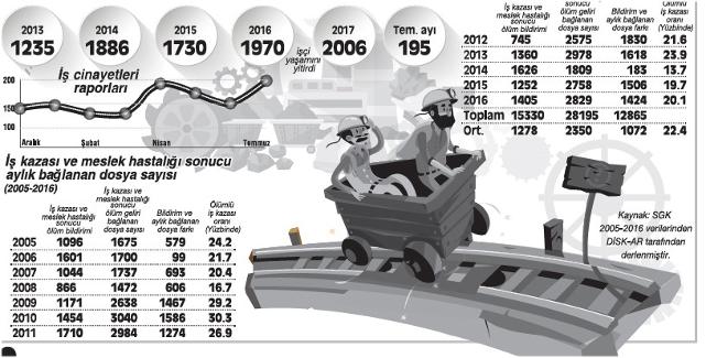 Örneğin 2005-2016 dönemi SGK verilerine göre bildirim yapılan iş kazası sonucu ölüm sayısı 15 bin 330 iken, iş kazası sonucu ölüm geliri bağlanan dosya (vaka) sayısı 28 bin 195. Neredeyse iki katı.