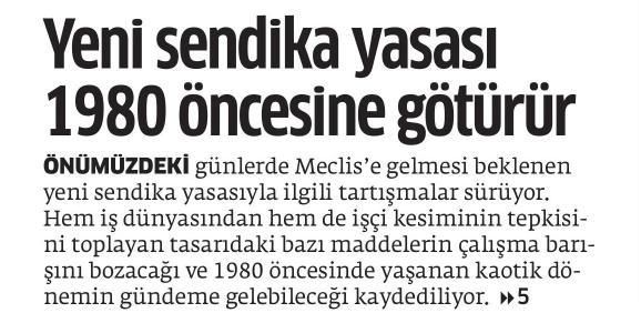 ÖNÜMÜZDEKİ günlerde Meclis´e gelmesi beklenen yeni sendika yasasıyla ilgili tartışmalar sürüyor. Hem iş dünyasından hem de işçi kesiminin tepkisini toplayan tasarıdaki bazı maddelerin çalışma barışını bozacağı ve 1980 öncesinde yaşanan kaotik dönemin gündeme gelebileceği kaydediliyor.