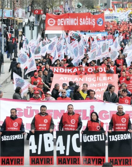 Dikimevi’nde toplanan emekçiler öğle saatlerinde kortej oluşturarak Kolej Meydanı’na doğru yürüyüşe geçti. Kortejde, “Güvenceli gelecek, birleşik mücadele” ana pankartının önünde, “Sözleşmeli hayır, 4-B hayır, 4-C hayır, Ücretli hayır, Taşeron hayır, 50-D hayır” yazılı dövizleri taşıyan işçiler yer aldı. Yaklaşık 30 sendika, meslek ve sivil toplum örgütü ile bazı siyasi partilerin de destek verdiği mitinge DİSK ve KESK’e bağlı sendikalardan geniş katılım oldu. Eyleme Türk-İş’e bağlı 7 sendika da destek verdi. Emekçiler sık sık ıslıklarla ve düdüklerle AKP’yi protesto etti.