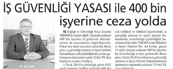 Buna göre, iş güvenliği uzmanı ve işyeri hekimi bulundurma yükümlülüklerini yerine getirmeyen işletmeleri aylık 11 bin TL’den başlayan cezalar bekliyor. 1 Ocak 2014’te yürürlüğe giren 6331 sayılı kanunla birlikte yaklasık 680 bin çok tehlikeli ve tehlikeli işyerlerinde, iş güvenliği uzmanı ve işyeri hekimi bulundurma zorunluluğu getirildiğini hatırlatan Güvenbir OSGB Genel Müdürü ve İşyeri Hekimi Dr. Ali Çolak, geçen 15 aylık süreçte yaklaşık 400 bin işletme bu zorunluluğu yerine getirmedi.