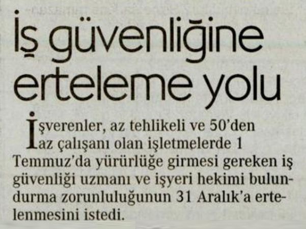 İşverenler, az tehlikeli ve 50´den az çalışanı olan işletmelerde 1 Temmuz´da yürürlüğe girmesi gereken iş güvenliği uzmanı ve işyeri hekimi bulundurma zorunluluğunun 31 Aralık´a ertelenmesini istedi.