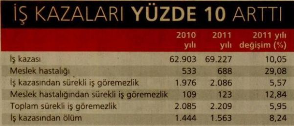 Türkiye iş kazalarında Avrupa ile karşılaştırılamayacak kadar kötü bir nota sahip. Dünyada iş kazalarında ilk sıralarda yer alan Türkiye, bu alanda Avrupa ile değil Çin ile karşılaştırılıyor. İş kazalarının en fazla inşaat, madencilik ve taşımacılık gibi çalışanların eğitim, nitelik ve örgütlenme olarak zayıf olduğu sektörlerde yaşanması da bu durumun sonuçlarından biri.