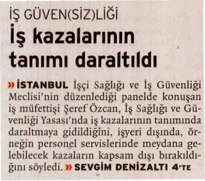 İstanbul İşçi Sağlığı ve İş Güvenliği Meclisi´nin düzenlediği panelde konuşan iş müfettişi Şeref Özcan, İş Sağlığı ve Güvenliği Yasası´nda iş kazalarının tanımında daraltmaya gidildiğini, işyeri dışında, örneğin personel servislerinde meydana gelebilecek kazaların kapsam dışı bırakıldığını söyledi.