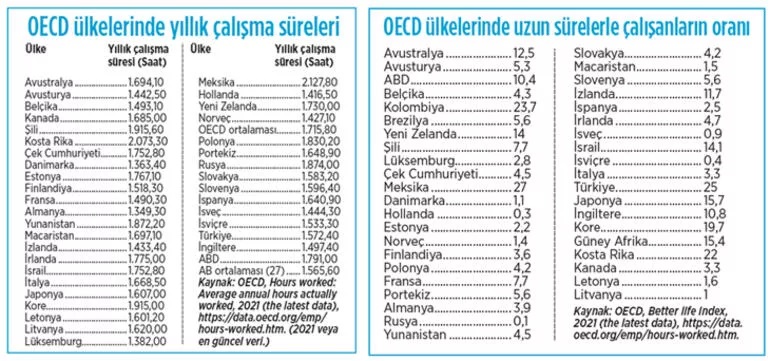 Yıllık toplam çalışma süresi OECD ülkelerinde ortalama 1.715,8 saat. Bazı ülkelerdeki yıllık toplam çalışma süresi OECD ortalamasının çok üzerinde. Bu ülkeler, 2.127 saat ile Meksika, 2.073 saat ile Kosta Rika, 1.915 saat ile Şili ve yine 1.915 saat ile Kore. Öte yandan, Almanya (1.349 saat), Lüksemburg (1.382), Danimarka (1.363 saat), Hollanda (1.416,saat) ve Norveç (1.427 saat) OECD ülkeleri içinde yıllık ortalama çalışma sürelerinin göreli olarak daha düşük olduğu ülkeler.