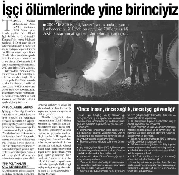 TMMOB Makina Mühendisleri Odası (MMO) tarafından 18-20 Nisan günlerinde yapılan "VII. Ulusal işçi Sağlığı ve iş Güvenliği Kongresi"nin sonuç bildirgesi açıklandı. 1500’ü aşkın kişinin kanlımıyla toplanan Kongre’nin sonuç bildirgesine göre, Türkiye her 100 bin çalışan başına düşen ölümlü iş kazalarında Avrupa’da birinci ve dünyada üçüncü sırada yer alıyor. 2008 yılında 865 olan iş kazası sonucu ölüm sayısı, 2011 yılında bin 700’e yükseldi.