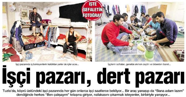 Tuzla´da, köprü üstündeki işçi pazarında her gün onlarca işçi saatlerce bekliyor… Bir araç yanaşıp da Bana adam lazım dendiğinde herkes Ben çalışayım telaşına giriyor, nafakasını çıkarmak isteyenler, birbiriyle yarışıyor… İşçi pazarında iş bekleyenlerin kaldıkları yerler de içler acısı… İşçilerin sofraları, genelde ekmek-zeytin ve biberden ibaret..