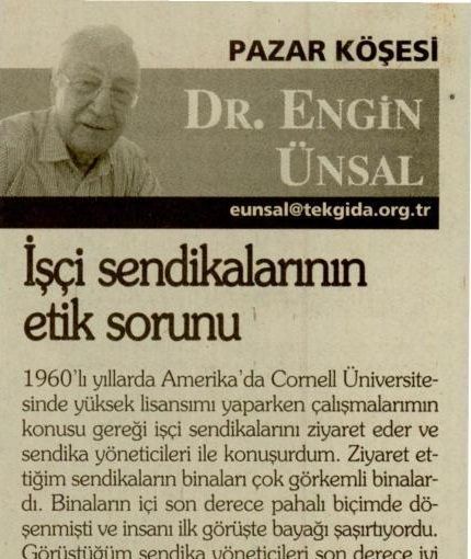 Bazı işçi sendikası yöneticilerinin akçalı (paralı) konularda özensiz ve sorumsuz davranışlan ve bunun basında yer bulması son derece rahatsız edici bir konudur ve ciddi bir etik sorunu yaşandığına işaret etmektedir.