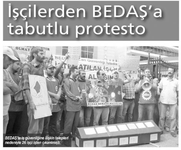 Dün Taksim Meydanı’nda bir araya gelen işçiler buradan sloganlarla ve ellerinde taşıdıkları tabutla BEDAŞ Genel Müdürlüğü’ne yürüdü. İşlerinden çıkarıldıktan sonraki 1 ay içerisinde meydana gelen iş kazalarını, taşıdıkları temsili tabut üzerine yazan işçiler sık sık "Direne direne kazanacağız", "Atılan işçiler geri alınsın" ve "Çalışırken ölmek istemiyoruz" şeklinde sloganları attı.