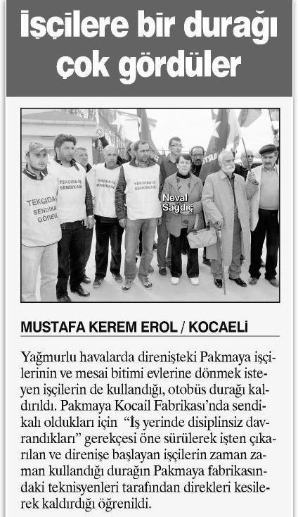 Pakmaya Kocail Fabrikası’nda sendikalı oldukları için "İş yerinde disiplinsiz davrandıkları" gerekçesi öne sürülerek işten çıkarılan ve direnişe başlayan işçilerin zaman zaman kullandığı durağın Pakmaya fabrikasmdaki teknisyenleri tarafından direkleri kesilerek kaldırdığı öğrenildi.