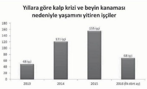 İSİG Meclisi, Türkiye’deki ağır çalışma koşulları ve bu koşulların işçi sağlığına etkileri üzerine çarpıcı bir rapor hazırladı. Raporda, "Türkiye’de haftalık çalışma saati ‘ortalama’ 50 saatin üzerinde. İzin hakları kullanılamıyor. Üç işçinin yapacağı iş bir işçiye yaptırılıyor. İşyerlerinde sağlık ekibi ve ambulans yok. Soma’daki maden işçilerinden mevsimlik tarım işçilerine kadar işçilerin başında ‘hadi hadi’ diyen dayıbaşları, çavuşlar, taşeronlar var. Bu süreç bugün kiralık işçilik, özel istihdam büroları, kıdem tazminatının kaldırılması, iş mahkemeleri kanununun değiştirilmesi gibi birçok saldırı ile derinleştiriliyor. İşte tam da bu noktada aşırı, yoğun ve fazla çalışma nedeniyle işçiler çalışırken aniden yaşamını yitiriyor" denildi.