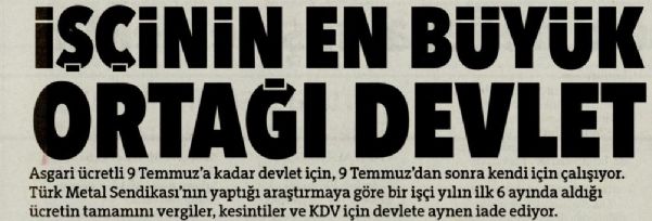 Asgari ücretli 9 Temmuz´a kadar devlet için, 9 Temmuz´dan sonra kendi için çalışıyor. Türk Metal Sendikası´nın yaptığı araştırmaya göre bir işçi yılın ilk 6 ayında aldığı ücretin tamamını vergiler, kesintiler ve KDV için devlete aynen iade ediyor.