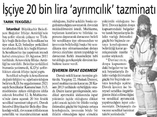 Belediye yetkilileri bununla yetinmedi, KD’yi şoförlükten alarak itfaiye işçisi yaptı. Sendikal sebeple iş koşullarının değiştirildiğini ve ağırlaştırıldığını belirten K.D, bu uygulamanın 2821 sayılı Sendikalar Kanunu’nun 31/5. maddesine aykırı olduğunu iddia ederek İstanbul 12. İş Mahkemesinde dava açarak 20 bin liralık sendikal tazminat talep etti.