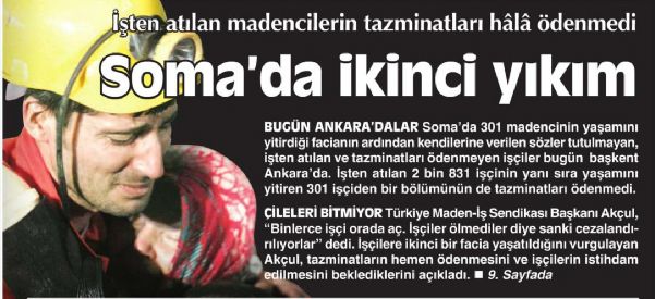 Hükümet 301 işçinin yaşamını yitirdiği Soma’da verdiği sözleri tutmadı. Kimsenin mağdur edilmeyeceği söylemine karşın Soma’da yaşamını yitiren 301 madencinin bir bölümünün tazminatları bile ödenmedi, işverenin işten çıkardığı 2 bin 831 işçi ile birlikte tazminatları ödenmeyen işçilerin sayısı 3 bine ulaştı. İşçiler seslerini duyurabilmek amacıyla Ankara’ya gitme kararı alırken Türkiye Maden-lş Sendikası Başkanı Nurettin Akçul, "Binlerce işçi orada aç… işçiler ölmediler diye sanki cezalandırılıyorlar" dedi.