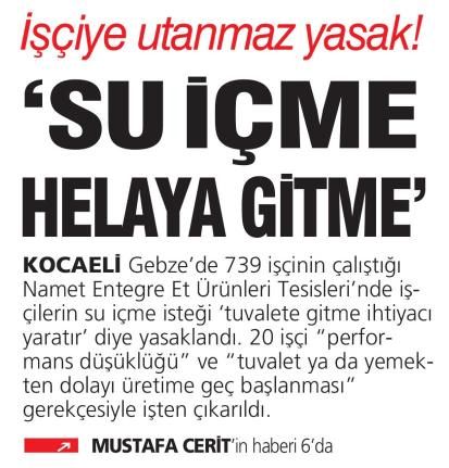"Cumartesi ve Pazar günleri için mesai zorunlu hale getirildi" diyen Tiryaki, başına gelen bir olayı şu sözlerle anlattı: "Haftasonu mesai zorunlu hale getirildi. Acil işlerim olması nedeni ile gidemediğim mesailer oldu. Hakkımda toplam 5 tutanak hazırladılar. Bu tutanaklan imzalamamı istediler. Ben de tutanakların altına, yasalara göre mesainin zorunlu olmadığını, acil işlerimden dolayı gelmediğimi yazarak imzaladım. Sendikaya üye olduğumu öğrendikleri için ‘Burada iş kanunlan değil, Namet kanunları geçerlidir’ diyerek işten çıkardılar."