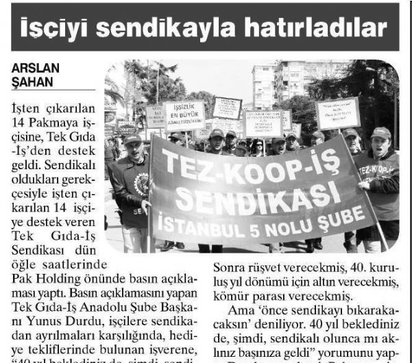 İşten çıkarılan 14 Pakmaya işçisine, Tek Gıda -İş’den destek geldi. Sendikalı oldukları gerekçesiyle işten çıkarılan 14 işçiye destek veren Tek Gıda-İş Sendikası dün öğle saatlerinde Pak Holding önünde basın açıklaması yaptı.