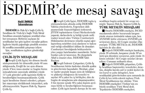 İŞDEMİR´de Hak-İş´e bağlı Çelik-İş Sendikası ile Türk-İş´e bağlı Türk Metal Sendikası arasında başlayan sendikal rekabet tırmanıyor. Birbirini suçlayan iki sendikadan her gün işçilere mesajlar gidiyor. işçilerin büyük çoğunluğu şimdilik sessizce iki sendika arasındaki çatışmayı izliyor. İşte, sendikaların işçilere gönderdiği mesajlar: