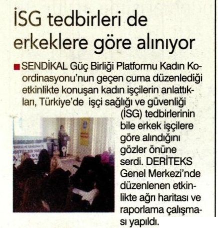 SENDİKAL Güç Birliği Platformu Kadın Koordinasyonu´nun geçen cuma düzenlediği etkinlikte konuşan kadın işçilerin anlattıkları, Türkiye´de işçi sağlığı ve güvenliği (İSG) tedbirlerinin bile erkek işçilere göre alındığını gözler önüne serdi.