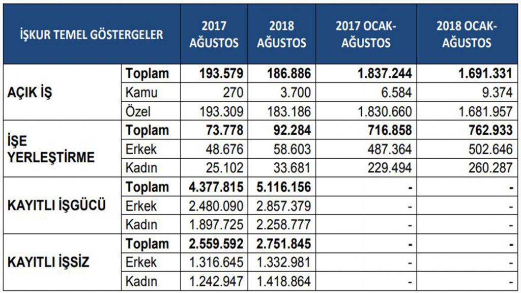 İŞKUR’un 2018 yılı Ağustos bültenine göre;
