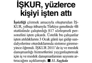 Üstelik bu çalışanlar işten atıldıkları 3 Ocak günü işe gidip sandalyelerine oturduklarında sisteme giremeyince öğrendi. İŞKUR 2011 ‘de iş ve meslek danışmanlığı hizmetlerini yaygınlaştırmak için iş ve meslek danışmanlarının sayışım artıracağını açıklamıştı.