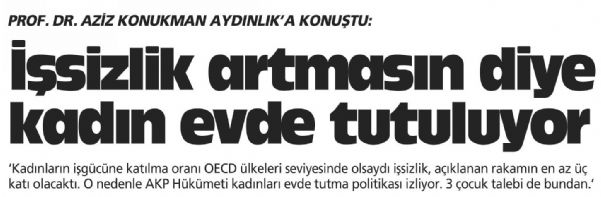 PROF. Dr. Aziz Konukman AKP’nin kadın istihdamına yönelik politikalarını ve işsizlik rakamlarını Aydınlık’a değerlendirdi. Gazi Üniversitesi İktisadi ve İdari Bilimler Fakültesi Öğretim üyesi Prof. Dr. Konukman, AKP’nin kadınların iş talebinde bulunmamasını, evde oturmasını istediğini 3 çocuk talebinin de bundan kaynaklandığını bildirdi.